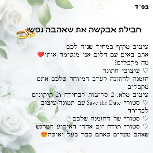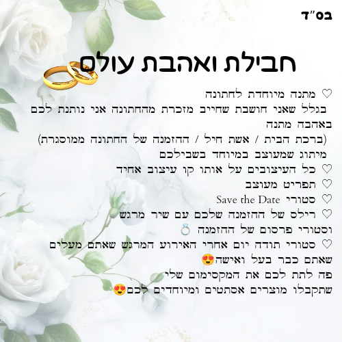 אני כאן כדי להציע ליווי מלא לאורך כל התהליך – מהרעיון הראשוני ועד למוצר הסופי. אני מלווה אתכם בכל החלטה, מציעה פתרונות יצירתיים ודואגת שכל פרט יהיה מושלם. החזון שלי הוא ליצור עיצובים שמרגשים, שמספרים סיפור ונותנים חוויה ייחודית – שילוב של רגש, מקצועיות ואסתטיקה. כל יצירה שלי היא ניסיון לשמור על הרגעים החשובים, להדגיש את הייחודיות של כל לקוח, וליצור משהו שיישאר בזיכרון לאורך זמן